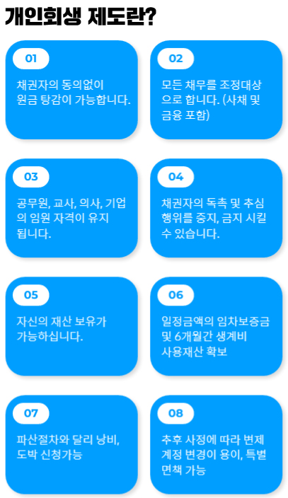 모든 채무를 조정 대상 (주식 빚, 사채 빚, 사금융 포함)으로 하며 채권자의 동의 없이 원금 탕감이 가능하며 가장 힘겨웠던 채권자의 독촉 및 추심행위를 중지, 금지 시킬 수 있습니다.