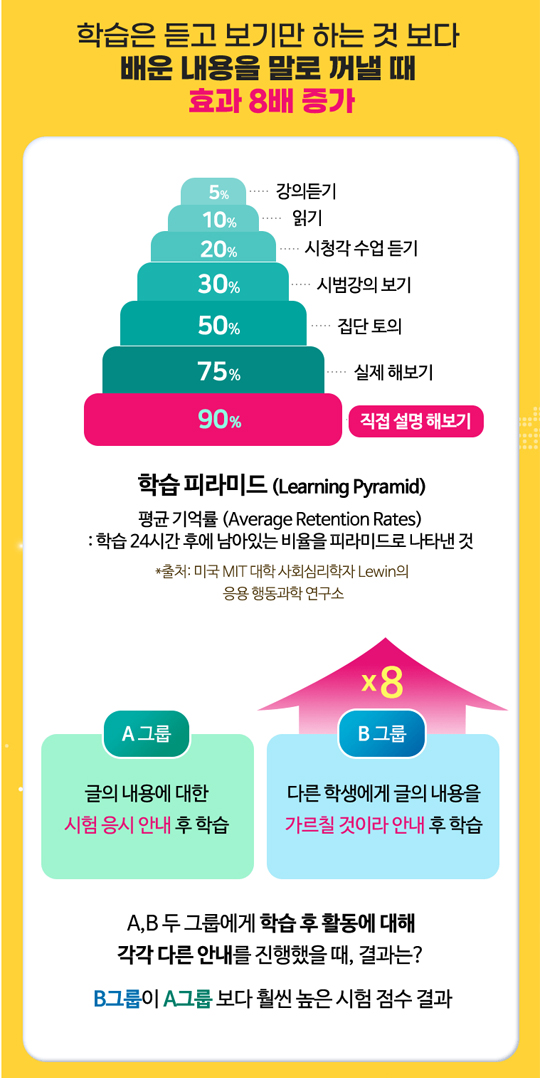 · 학습은 듣고 보기만 하는 것 보다 배운 내용을 말로 꺼낼 때 효과 8배 증가