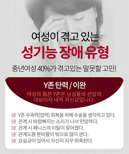 30대를 지나 40대 50대 중년으로 접어들며 여성호르몬 감소에 따른 여성 갱년기 증상이나 결혼 · 출산 · 노화로 인한 여성 성기능장애 Y존탄력 저하와 요실금 증상과 여성불감증 및 극치감 장애 등 나타날 수 있어요.