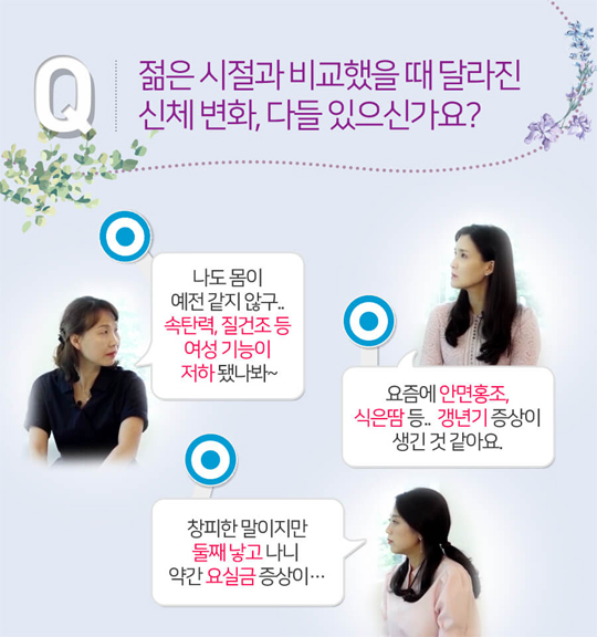 특히 한국 여성의 평균 폐경 나이는 약 50세 정도라고 하며 여성호르몬의 감소와 함께오는 폐경, 이 시기에 급격한 노화가 찾아 온다고 해요.
