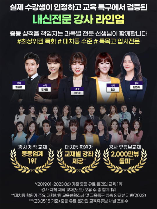 실제 수강생이 인정하고 교육 특구에서 검증된 내신 전문 강사 라인업 중등 성적을 책임지는 과목별 전문 선생님이 합께합니다.
