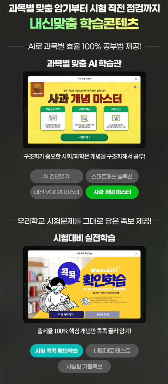 과목별 맞춤 암기부터 시험 직전 점검까지 내신 맞춤 학습 콘텐츠! AI로 과목별 효율 100% 공부법 제공!