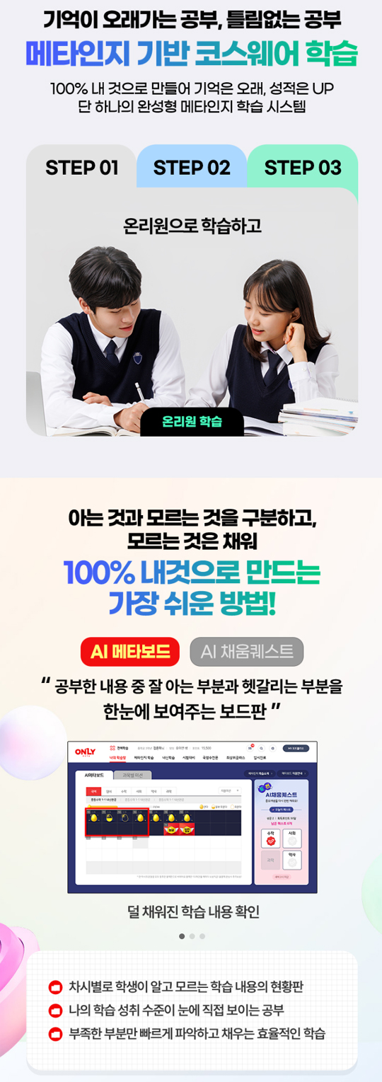 기억이 오래가는 공부 메타인지 기반 코스웨어 학습! 100% 내 것으로 만들어 기억은 오래 성적은 UP 단 하나의 완성형 메타인지 학습 시스템!